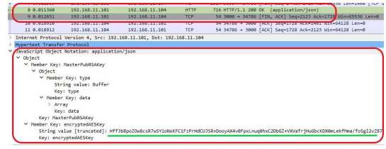 Figure.12 shows the master’s response as a token encrypted with the session key. Then the slave can decrypt and retrieve the clear text information in JSON format containing group id (GID), object id, public address key, and the preceding field’s ECDSAsignature concatenated.