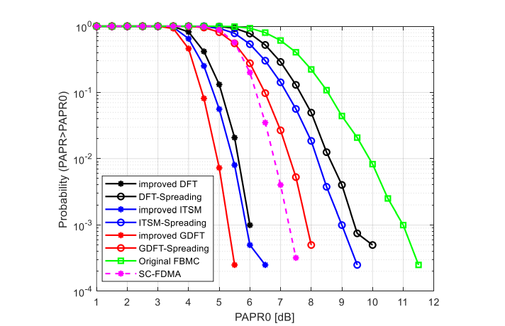 The discrete Fourier transform (DFT) spreading technique is one of the single carrier effect techniques and it is the technique that is used in SC-FDMA. In [17]-[19] the DFT spreading technique being used in FBMC for PAPR improvement but the amount of reduction of PAPR is far away from the PAPR improvement amount that is attained by SC-FDMA. This is due to in [17]-[19] the DFT spreading is applied directly to the FBMC system without taking the staggering between in-phase and quadrature (IQ) channels into consideration. In [20] the DFT spreading technique had been used in the case of Identically-time shifted modulation (ITSM). This condition is based on the phase shift pattern of the in-phase and quadrature channels. Although the DFT spreading with the ITSM condition makes use of the single carrier effect, the amount of PAPR reduction is not so significant. So, the authors in [20] proposed an ITSM algorithm to increase the PAPR reduction amount by producing four waveforms with different PAPR, and the one with minimum PAPR was chosen to be sent. But, using the ITSM algorithm caused more computational complexity and side information (SI). In [21], GDFT had been proposed in FBMC as a single carrier effect technique instead of DFT as the latter resulted in a marginal PAPR reduction. Although using GDFT spreading improves the PAPR reduction performance more than that of various single carrier techniques, the PAPR reduction amount is not still as good as SC-FDMA. So, the authors in [21] introduced an improvement algorithm to allow the GDFT spreading to enhance PAPR as efficiently as SC-FDMA. However, the