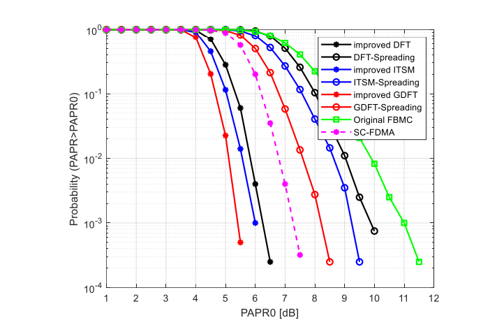 In this section, the PAPR performance of the single carrier techniques utilizing the proposed algorithm versus the conventional single-carrier techniques is discussed. Also, the transmitted FBMC and SC-OFDMA signals are included to be taken as a reference. Simulation results are performed through upgrading related m-file using MATLAB package version 2021a. The parameters on which the simulation is based are listed in Table 1. The simulation parameters are selected to be the same as the parameters that existed in [20] and [21] so that the obtained simulation results are fairly compared to other conventional single-carrier techniques in [20] and [21]. The PAPR performance is assessed by the complementary cumulative distribution function (CCDF) which is denoted by (PAPR0) [29-30]. The DFT spreading technique after using the proposed algorithm will be called the improved DFT, improved ITSM and improved GDFT.