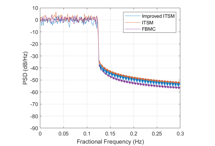 The PSD characteristics for the FBMC single carrier techniques with and without using the improved algorithm are demonstrated in figure 8. Using a 0.2 normalized frequency as a mask, the DFT spreading and the GDFT technique before using the improved algorithm have lower OOB by -2 dB and -1 dB respectively compared to the same techniques after using the improved algorithm as it is shown in figure 8(a) and (c). In case of ITSM technique, the use of the improved algorithm does not affect the PSD performance as shown in figure 8(b).
