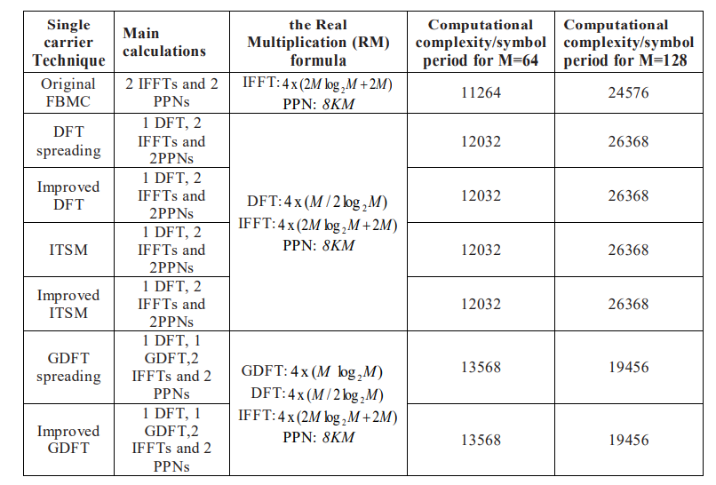 In this section, we introduce a computational complexity comparison of the single carrier techniques which utilize the proposed algorithm versus the conventional single-carrier techniques. The computational complexity is measured based on the number of additions and the real multiplication. However, measuring computational complexity based on the number of additions is not considered as multiplication carries the highest computational load. It is depicted in from Table 2 that the improved single carrier techniques have the same complexity overhead as that of the conventional techniques.