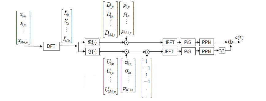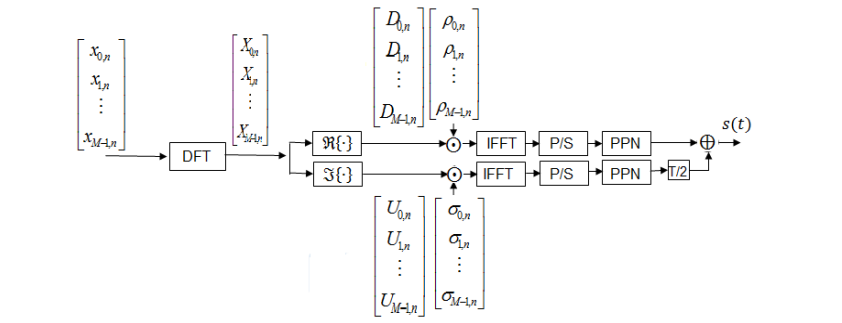 components are shifted in time by half of the complex data symbol duration for each subcarrier T. this is done by applying the lower PPN output to the delay block T/2[27].