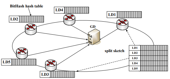 a piece of a sketch, that is, a hash table of a special designed bitwise hash function; in this way the LD aggregates packets into bitwise flows according to certain bits in their destination IPs (dstIP). The aggregation significantly reduces the scale of time-series measurement data of network traffic. LDs thus can detect when network anomalies occur and identify flows that involves these anomalies, using a PCA-based anomaly detection method. The method is like [6] and extended for identifying more than one anomalous flow. LDs send very little data to the GD including IDs of Anomalous Flows (AF). In view of the whole F-LOW system, all hash tables performed by LDs constitute a virtual sketch, called split sketch. The GD integrates flow IDs into split sketch and determines anomalies pervading all over the network as DDoS attacks. Taking advantage of bitwise hash functions, the GD can reconstruct (partial) victim IPs of DDoS attacks reversely with much lower computational cost and smaller space requirement than previous work [8][9][10].
