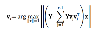 Let X be an 𝑛 × 𝑚 data matrix. Each row of X is viewed as a point in an m-dimensional space. PCA projects points in X into an 𝑟 -dimensional space ( 𝑟 < 𝑚 ) and finds projections that maximize the variance of 𝑛 points. The first principal component is the direction along which projections of these points have the largest variance. By analogy, the 𝑟-th principal component is the orthogonal direction that has maximum variance with respect to previous 𝑟 − 1components. Before performing PCA, a mean of zero is needed for each column so as to find a basis that minimizes the mean square error. Let Y be the zero-meaned matrix of X. Then we can calculate the r-th principal component vr as follow.