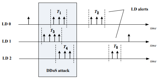 When a DDoS attack is launched, the malicious attack traffic accessing the attack target is relatively concentrated. From the point of view of distributed attack detection, the traffic abnormal alarm generated by each local detection device should also have time correlation. Therefore, when the global detection device finally determines the DDoS attack, it should consider the time when the abnormality occurs. If many abnormal traffic alarms occur in a short time, it can be considered that a large-scale DDoS attack has occurred in the network. As showed in Figure 3, a DDoS attack can be confirmed when LD0, LD1 and LD2 all reports local anomaly alerts nearly in the same time.