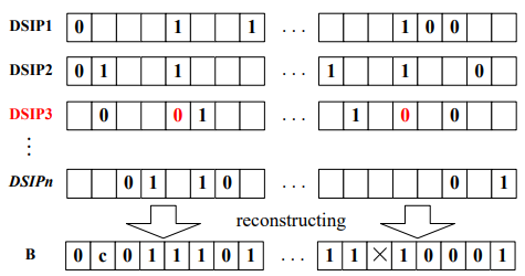 Eliminate noise DSIPs. We define DSIPs that comport with real victim IPs of DDoS attacks are majority DSIPs, and others are noise DSIPs. The latter DSIPs probably arise from some local network changes, rather than network-wide DDoS attacks. We thus consider a DSIP as a noise DSIP if it sets some bits just in contrast to what most other DSIPs do. Let Γ be the set of DSIPs received from LDs. For each bit in 𝚩, we count the numbers 𝑞0,𝑖 and 𝑞1,𝑖 of DSIPs that reify the bit as “0” and “1” respectively. The much smaller number between them implies corresponding bit (“0” or “1”) is unpopular. Each DSIP reifies 𝑘 different bits. If a DSIP reifies at least one unpopular bit, we consider it as a noise DSIP. We can obtain a more reliable set 𝚪 ′ by eliminating noise DSIPs from Γ. Note that the input set Γ only includes DSIPs whose timestamps fall in the same time period (about several time intervals). Because network anomaly appears around the same time are more likely to be consequence of DDoS attacks.