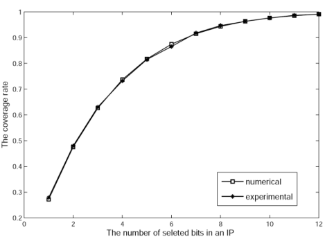 Figure 7. The numerical and experimental coverage rates with respect to the number of selected bits in an IP