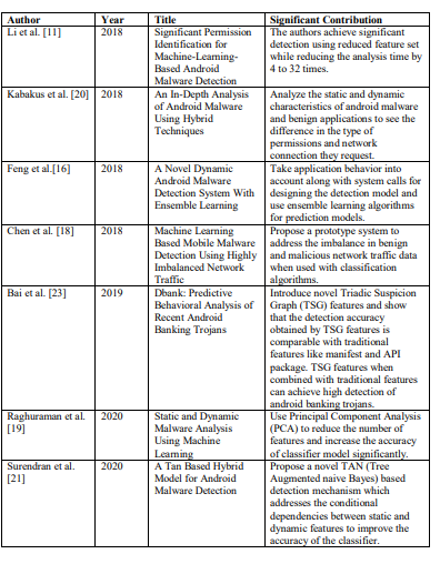 The In this section, previous research works related to the static, dynamic and hybrid analysis of malware are presented. DroidAnalytics [6] is a signature based detection system that defines a three level signature generation which is robust against obfuscation. Other prominent work in the field of android malware detection include DroidAPIMiner [9], which uses API calls to predict android malware. Peiravian et al. [10] on the other hand, uses both permission and API call features to build detection models for android malware and shows that a combination of permissions and API calls is more effective than using either of the features separately. SigPID [11] uses a reduced permission set to detect android malware with significant accuracy reducing the analysis time. Both Drebin [12] and [13] use wide range of feature sets such as system commands, permissions and API calls extracted by static analysis for building prediction models. For prediction model based on dynamic analysis, [14] and [15] use system call as feature. In the work of [16], system call along with other behavioural features such as cryptographic operation, network operation and information leaks extracted using DroidBox tool are used for detecting android malware. Aside from system calls, Arora et al. [17] and Chen et al. [18] studied network traffic-related parameters to build the prediction model.