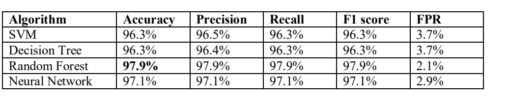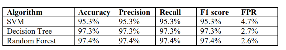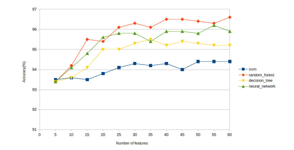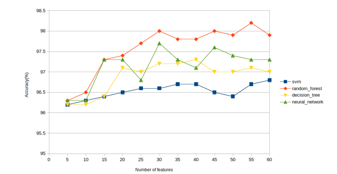 Among all the learning algorithms, Random Forest shows the best performance for both feature selection methods with highest accuracy around 98%. The slightly better performance of Random Forest can be attributed to the fact that it is an ensemble learning based classifier and combines output from multiple decision trees. Apart from Random Forest, other three learning algorithms also achieve detection accuracy above 95%.