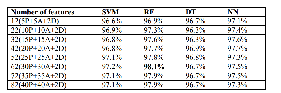 The accuracy of the classifiers with respect to the combined features (permissions, API calls and dynamic features) is presented in Table 7. In the table, the notation P' represents number of permissions,A’ represents number of API calls and `D’ represents number of dynamic features.