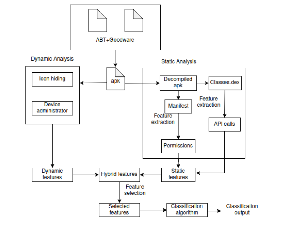 Traditionally, malware detection systems use signatures to identify malware. Signature of a malware is a piece of string that is extracted from the malware and is unique. One major drawback of signature-based detection system is that it is very easy to alter the signature of a malware with minor modifications to escape detection [6]. Hence, commercial anti-virus products are moving towards the adoption of machine learning techniques to detect malware [7]. The features used to build the machine learning models can be obtained through static analysis, dynamic analysis or a combination of both [8]. In static analysis, the contents of a malware are analysed without executing it whereas in case of dynamic analysis, a malware is executed to examine its behaviour and its features are extracted. In hybrid analysis, features from static and dynamic analysis are combined. The features are then used with detection methods to classify malware. Our proposed system uses hybrid analysis with machine learning algorithm to design a detection system for ABTs. We extract four feature sets – permissions, API calls, icon hiding and device administrator and use them with multiple machine learning algorithms to see their behaviour towards the detection of ABTs. Two features – permissions and API calls are extracted through static analysis whereas icon hiding and device administrator features are extracted