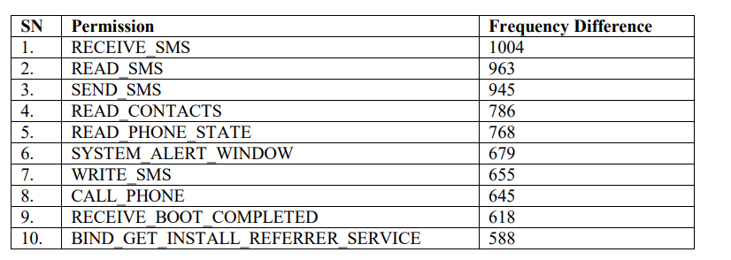 Table 2. Top 10 permissions with highest frequency difference.