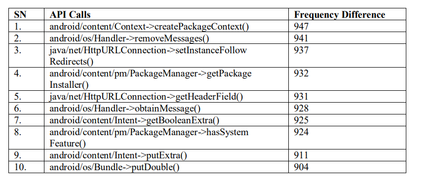 Table 3. Top 10 API calls with highest frequency difference.