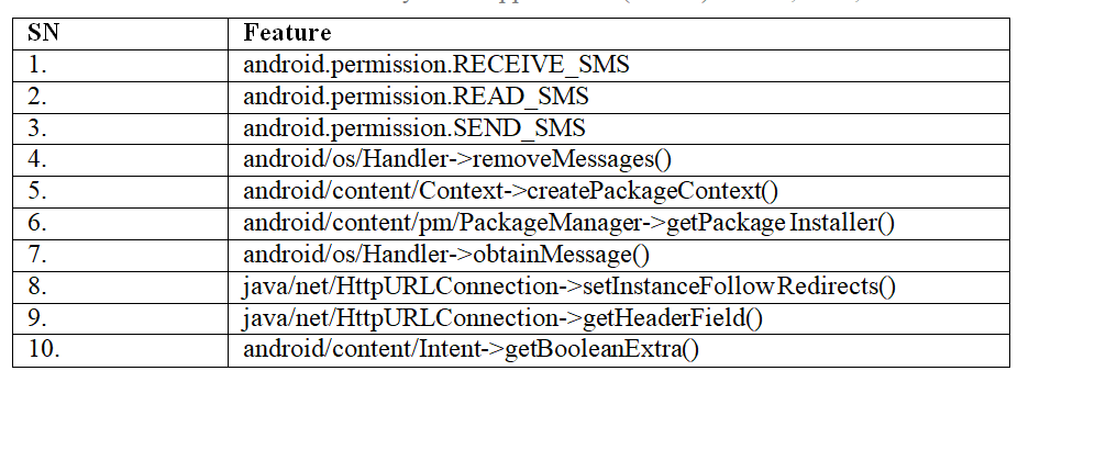 From Table 1, we can see the permissions with largest frequency difference between banking trojans and good-ware are related to SMS and phone calls. Android banking trojans generally request more permissions related to SMS and phone calls. Similarly, the ten API calls with highest frequency difference between banking trojans and good-ware are listed in Table 3.
