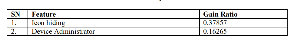 From Table 3, we can see that the features with largest gain ratio are permissions related to SMS and API calls related to ‘android/os’, ‘android/content’ and ‘java/net’ packages. Furthermore, no dynamic features are selected through this process because the gain ratios of both dynamic features are less than 0.5 as shown in Table 5.