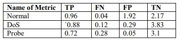 2) Metrics of TP, FN and FP have been obtained and tabulated below for Normal, DoS and Probe attacks.