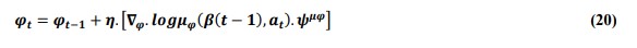 The aim of the work in terms of the algorithm is to maximize the instantaneous reward of the MDP rµ(t) depending on the average Bayesian log likelihood ratio =avg(β). The algorithm ensures to minimize the squared value of temporal error ψµφ(t). The Actor update towards the target value follows.