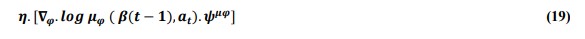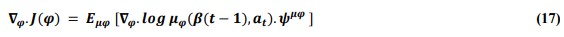 Policy gradient helps the actor to get updated. TD error (ψ) from equation [16] will be used to compute the gradient as depicted in the equation below: