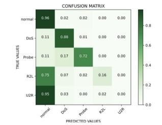 Fig.6 depicts the colour encoded heat map to represent the confusion matrix. Best True Positive value achieved for normal attacks according to the chart is nearly 0.96 .