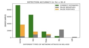 Fig.5 represents the average value of accuracy of detection of network attacks. The bar plot gives a comparative visualization of correct estimates, false positives and false negatives. False negatives refer to those sensor samples which are attacked and yet are left undetected; this is a serious threat to the system performance. However, a marginally better detection accuracy is witnessed for the normal, DoS and Probe attacks.