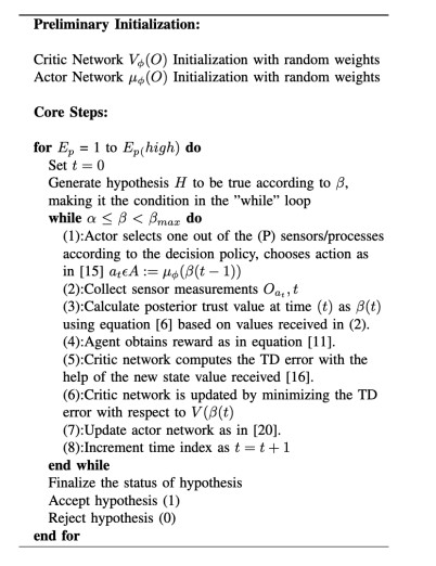 The Actor and Critic networks will be two separate neural networks which interact with each other productively. The actor explores and learns the policy (µ) on the true hypothesis characterized by say (φ) which maps the posterior trust distribution (β)to the action space i.e; chooses a valid action based on the posterior probabilities (β).Valid action refers to selecting the corresponding sensor and receiving the sample to update the posterior belief. In each iteration, the agent will score all valid actions, and choose the one with the highest score to execute.