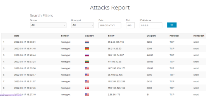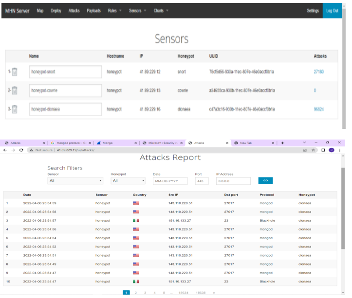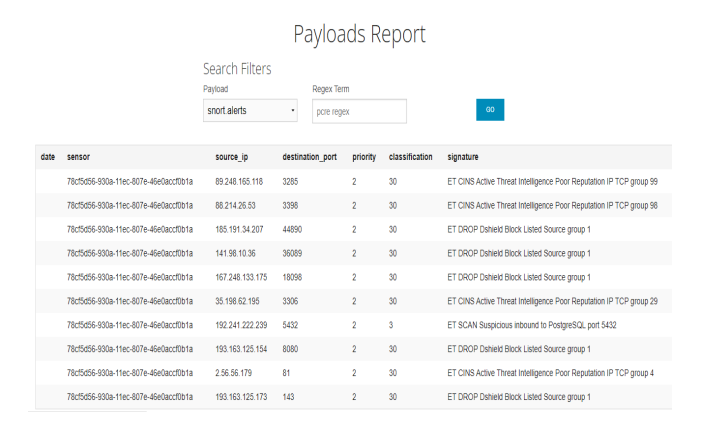 Various sensors were deployed as illustrated in Appendix 1. Snort was able to capture 27180 alerts, cowrie 0, and dionaea 96824 alerts within a period of one week. The output from the payload report indicated the source IP, destination port, the signature, the classification and reporting sensor as shown in Figure 2.