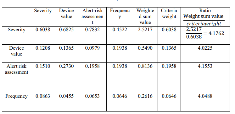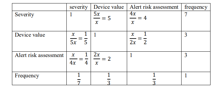 The values in the pair-wise matrix depend on the type of alert used when modelling the model being validated. This proof was obtained from the international vulnerability database. For example, if the alert was a Web application attack ,then device value was of strong importance than severity, ARA was of moderate to strong importance than severity, Alert Risk Assessment is of equal to moderate importance than device value Therefore, relating these judgments to the Saaty scale lead to formation of expression such that: If device value = x value then Alert Risk Assessment = 2x value and if severity = x value then device value = 5x value and if severity = x value Alert Risk Assessment = 4x value. The first step is to generate a pairwise comparison matrix as shown in Table 11.