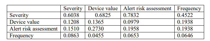 From the experiment results the device value metric for alert A1 at 1.66 was higher than its severity score of 0.55. This is reasonable because device value metric has more attributes than severity metric. The frequency score for alert A1 at 0.38 is higher than all other which make sense because it has higher number of recurrence in a given time interval than other alerts. The final metric weight, is highest in alert A1 at 5, this is reasonable because its priority and relevance are more weighty as compared to other alerts.