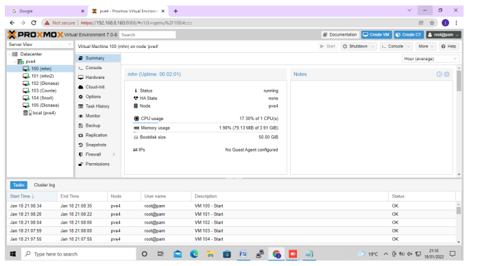 A Proxmox virtual environment was set up to host Modern Honey Net (MHN) server, snort, firewall, dionaea and cowrie virtual machines. Proxmox VE is complete open source server platforms for enterprise virtualization which help cut costs for IT departments and add server stability and efficiency. To install Proxmox Virtual Environment; we downloaded Proxmox ISO Image, prepared the Installation Medium, Launched the installer and ran Proxmox. Second VMs were created by uploading an ISO image which contained ubuntu-18.04-server to Proxmox VE. The VMs were created in Proxmox VE where the hard disk storage space, the number of cores and the RAM size of the VMs were defined. Lastly the OS was installed in the virtual machines. The experiment was carried out for two weeks in a controlled environment. All the alerts from the sensors were collected in the MHN server. Figure 1 shows a virtualised MHN server.