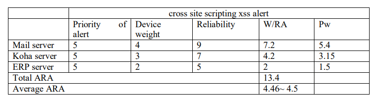 A number of cross site scripting alert originating from one particular source address within a given time interval was 27 out of a total number of 36.Therefore 27/36 =0.75. The probability of the alert in the range 0 to 1 was 0.75. This probability was used to compute the Pw in Table 5.