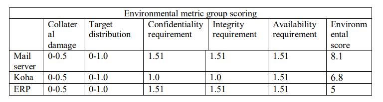 Table 3. Environmental metric group scoring for cross-site scripting on Mail, Koha and ERP servers based on CVSS database and questionnaire score guide