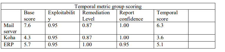 Table 2. Temporal metric group scoring for cross-site scripting on Mail, Koha and ERP servers based on CVSS database and questionnaire score guide