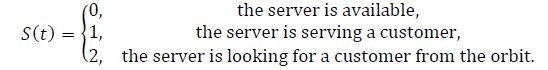 Let ๐1(๐ก) and ๐2(๐ก) denote the number of the servers that are serving a repeated customer or a fresh customer and those searching for a customer in the orbit, and ๐(๐ก) connotes the number of customers in the orbit at the moment ๐ก. It is evident that ๐(๐ก)={๐1(๐ก),๐2(๐ก),๐(๐ก);๐กโฅ0} generates the state space.