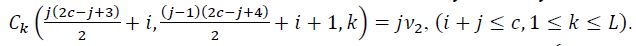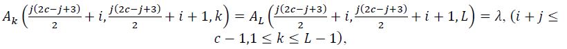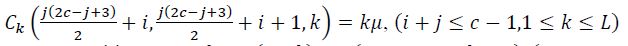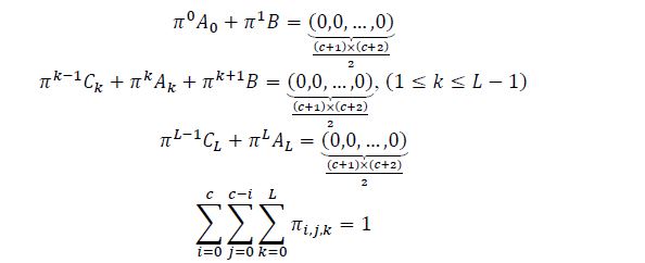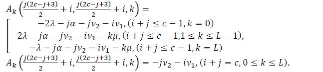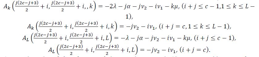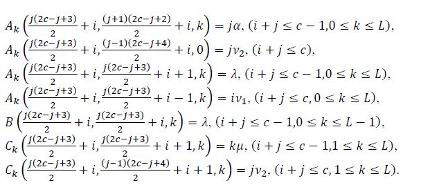 1) The values ๐ (0โค๐โค๐ฟ) are retained (the state transition rates from (๐,๐,๐) to (๐โฒ,๐โฒ,๐)). The state transition matrices are ๐ด0, ๐ดk and ๐ด๐ฟ. It is required to compute (๐,๐) within the range ((๐+๐)โค๐; ๐โฅ0,๐โฅ0)(โ). The number of pairs (๐,๐) fulfilling (โ) is ๐ถ2๐+2= (c+2)(c+1)/2.Also, it is the size of rows (or columns) of ๐ด0, ๐ด๐ and ๐ด๐ฟ. They contain entries following the indices of rows (or columns) as in Table 1.