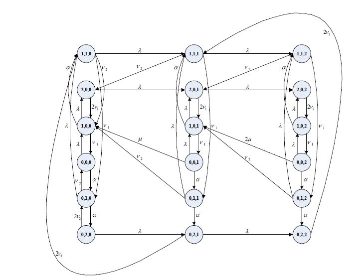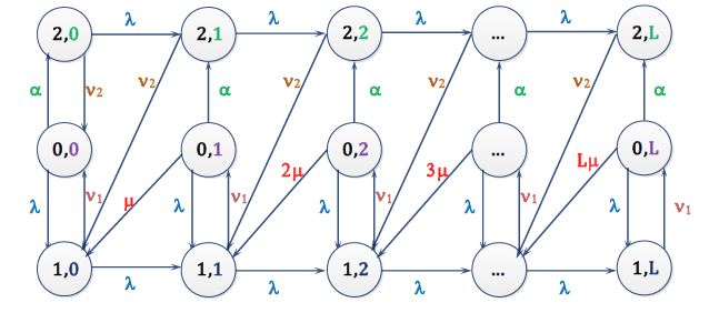 Let ๐(๐ก)(๐ก โฅ 0) denotes the number of customers in the orbit at the moment ๐กโฅ0. Then, {๐(๐ก)=(๐(๐ก),๐(๐ก)),๐กโฅ0} forms the Markov chain in the state space ๐ฎ={0,1,2}ร{0,1,2,โฆ,๐ฟ}. The state transition diagram is shown in Figure 1. We assume that the system is stable, which means that the steady-state probabilities subsist. The necessary and sufficient condition for the stable system is ๐<๐1that will be used in the following analyses [12].