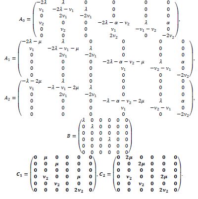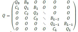 3) The values ๐ (1โค๐โค๐ฟ) decrease by one unit (the state transition rates from (๐,๐,๐) to (๐โฒ,๐โฒ,๐โ1)). The state transition matrices are ๐ถ๐. The size of ๐ถ is the same as that of ๐ด0, ๐ดk, ๐ด๐ฟ and ๐ต. Their non-zero elements are as follows:
