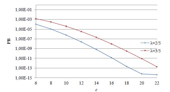 Figure 6. The blocking probabilities ๐๐ต following ๐.