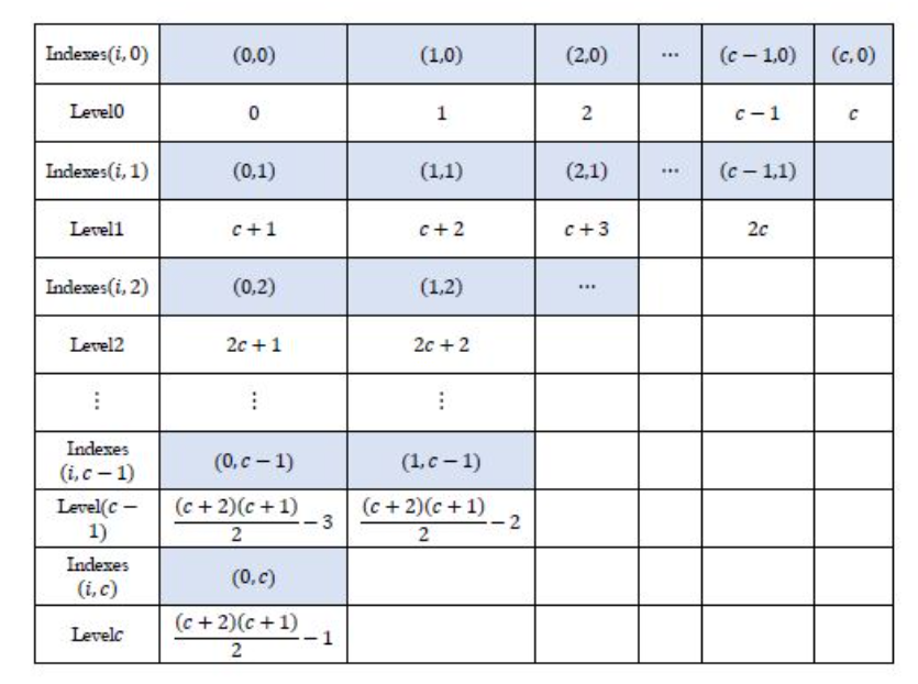 By indexing as mentioned, we compute the general indices (๐,๐) corresponding to (c+2)(c+1)/2 – (c+1-j)(c+2-j)/2 +i =j(2c-j+3)/2 + i.