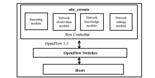 The sdn_reroute application wrote in python language for the approach for the Ryu controller. This application consists of four modules: the reroute module, monitor module, network knowledge module, and network settings module, as illustrated in Figure1.