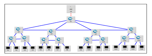 We use SDN, which has a structure illustrated in Figure 1. Ryu controller OpenFlow switches and hosts (devices). We will apply the rerouting approach for congestion control and then improve this with a secure protocol using the devices’ authentication protocol.Mininet generated the network topology diagram used in the proposal. The topology consists of a Ryu controller, 13 virtual switches (s₁-s₁₃), and 16 hosts (h₁-h₁₆) in Figure 2.