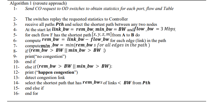 Moreover, this module detects the congested link that has the least as a result of consuming bandwidth by more flows, i.e., the of the congested link is less than the or the of a path is less than the , and then it reroutes to the shortest path that has links that have a higher than the .