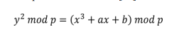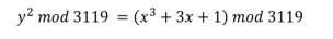 ———-Where all the variables and coefficients have values in the range of integers from 0 to p-1 and where computations are done modulo p. Emphasizes that for software applications, prime curves are ideal. Values =3, b= 1, and p = 3119 were offered from the curve that was used in Eq. (3).