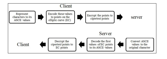 Step 3: As for the encrypt step, in the client module, for each encoded text ” ” as follows, it selects a random positive integer ( ), then it computes and , where is the public key of the server using point multiplication, then calls the encode method in the coding module to receive then computes + using point addition, and finally, it sends the ciphertext to the server.