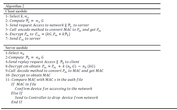 Step 2: The client module selects a random number and encrypts his device’s MAC address using ECC before sending it to the server. The plaintext message (MAC address) must be encoded first as a point Pm by calling the encode method in the coding module before being delivered. This method requires that the ASCII values of the characters be converted to their equivalent