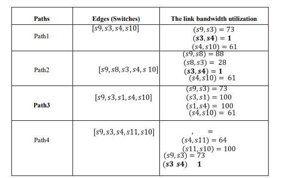 The algorithm selected the shortest path, path1 because it has fewer weights of edges than other paths, thus the link bandwidth utilization for Path1 is in Table 2. But, the algorithm detected congestion in this path by computing rem_bw for a link in the path that is less than , thus it is a congested link.The algorithm reroutes to another link that has the shortest path that is path 3 which has rem_bw less than , unlike other paths in Table 2.