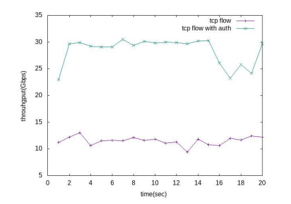 The server module confirms hosts or devices can access the network except for unauthorized devices; refer to the auth file. In our algorithm, select h3, h9, h6, and h13 as unauthorized devices that were dropped by the Ryu controller. We use to measure throughput between and again after applying the authentication approach in the same steps in the rerouting approach.In Figure 4 TCP Flow with Authentication, we use to measure throughput between andby running ” ” in Mininet Terminal, following the same steps as in the first stage of the congestion control mechanism. By comparing them, we find that the throughput has