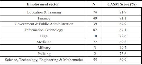 All employment sectors had average CASM scores except the military sector, which had a poor CASM score. The policing sector had the highest CASM score of 73.6% but had only two participants. A participant from the medicine sector had the lowest CASM score of 34.5%. Participants in the legal, education & training, and finance sectors had the next highest CASM scores of 72.6%, 71.9%, and 71%, respectively. The Military sector had the lowest CASM score of 49.7%. Table. 2 summarizes the CASM score by employment sector. Figure 1 depicts the employment sector CASM scores graphically. Hypothesis H2, stating that employees in the education, finance, information technology, legal, military, medicine, policing, government, and STEM sectors all have good CASM scores, was therefore rejected.