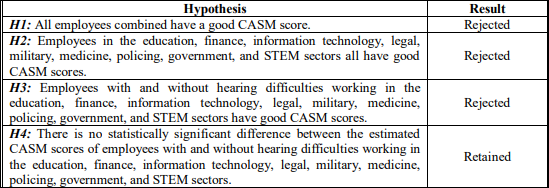 H3: Employees with and without hearing difficulties working in the education, finance, information technology, legal, military, medicine, policing, government, and STEM sectors have good CASM scores.