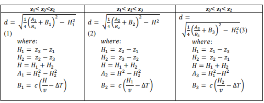 LSWTS [5] is a range-based, single-stage and silent localization scheme. It assumes the availability of two types of devices; mobile beacons and static sensor nodes. Beacon nodes dive and rise vertically at constant speed, v, known by every sensor node. They gather their location coordinates from GPS when rising at the surface. While diving, they broadcast localization messages at fixed intervals. A sensor node upon receiving two messages from a beacon node at different depths (say z1 and z2) calculates its distance d to that beacon. The calculation depends on the depth of the beacon relative to the depth of the sensor node (say z3), and there are three different cases as given in Table 1, where c is the speed of the sound underwater (assumed constant and equal to 1500 m/s). After computing the distance from three beacon nodes, the sensor node estimates its position using trilateration (refer to [3] for a more detailed explanation of this method).