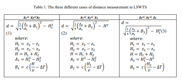 LSWTS [5] is a range-based, single-stage and silent localization scheme. It assumes the availability of two types of devices; mobile beacons and static sensor nodes. Beacon nodes dive and rise vertically at constant speed, v, known by every sensor node. They gather their location coordinates from GPS when rising at the surface. While diving, they broadcast localization messages at fixed intervals. A sensor node upon receiving two messages from a beacon node at different depths (say z1 and z2) calculates its distance d to that beacon. The calculation depends on the depth of the beacon relative to the depth of the sensor node (say z3), and there are three different cases as given in Table 1, where c is the speed of the sound underwater (assumed constant and equal to 1500 m/s). After computing the distance from three beacon nodes, the sensor node estimates its position using trilateration (refer to [3] for a more detailed explanation of this method).